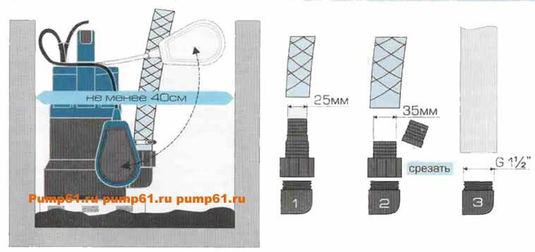 - вокруг насоса должно быть достаточно места для свободного движения поплавкового выключателя (см. рис.2);